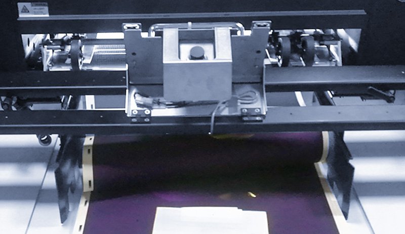 Fast-drying printing method using ultraviolet lights to cure inks which results in a gloss finish.